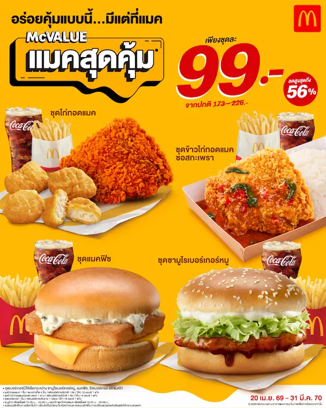 แมคโดนัลด์ ประเทศไทย ขอร่วมเป็นส่วนหนึ่งในการช่วยแบ่งเบาภาระ ค่าครองชีพของประชาชน ท่ามกลางวิกฤตพลังงานโลก พร้อมยืนหยัดเคียงข้างสังคมไทยในทุกสถานการณ์ ประกาศปักธง ‘แมคสุดคุ้ม’ ยืนยันราคาเดิม เพียงชุดละ 99 บาท เฉพาะที่แมคโดนัลด์เท่านั้น พร้อมเมนูอาหารที่หลากหลายและได้คุณภาพตามมาตรฐานระดับโลกของแมคโดนัลด์ ตอบโจทย์ทั้งความอิ่มอร่อยและความคุ้มค่าในราคาที่เข้าถึงได้ง่าย ตามแนวคิด “Value for Money” ที่ให้มากกว่าความอิ่ม แต่คือความคุ้มในทุกมื้อ ด้วยปริมาณ คุณภาพ และบริการที่วางใจได้ ทั้งยังช่วยให้ลูกค้าสามารถวางแผนค่าใช้จ่ายในแต่ละวันได้อย่างมั่นใจมากยิ่งขึ้น โดยมีเมนูที่ร่วมรายการ ดังนี้